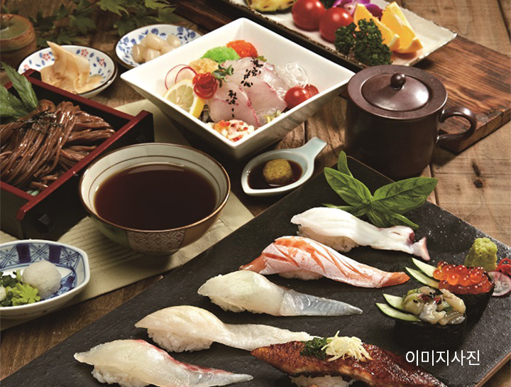 ① 프리미엄초밥코스 40,000 → 36000원 ② 연어초밥&연어롤 콤보 20,000 → 18,000원